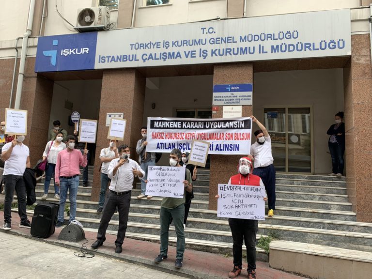 Cengiz İnşaat’ın haksız yere 25/II. maddeden işten çıkardığı 120 arkadaşımızın, benzer şekilde kriz ve koronavirüs salgını esnasında işten çıkarılan milyon işçinin ve ücret ve gelir kaybı yaşayan milyonların, genel olarak işçi sınıfının sorunları ve taleplerini dile getirmeye çalıştığımız basın açıklamamızda İŞKUR önünden patronların temsilcisi olduğunu haykırdığımız hükümete seslendik.